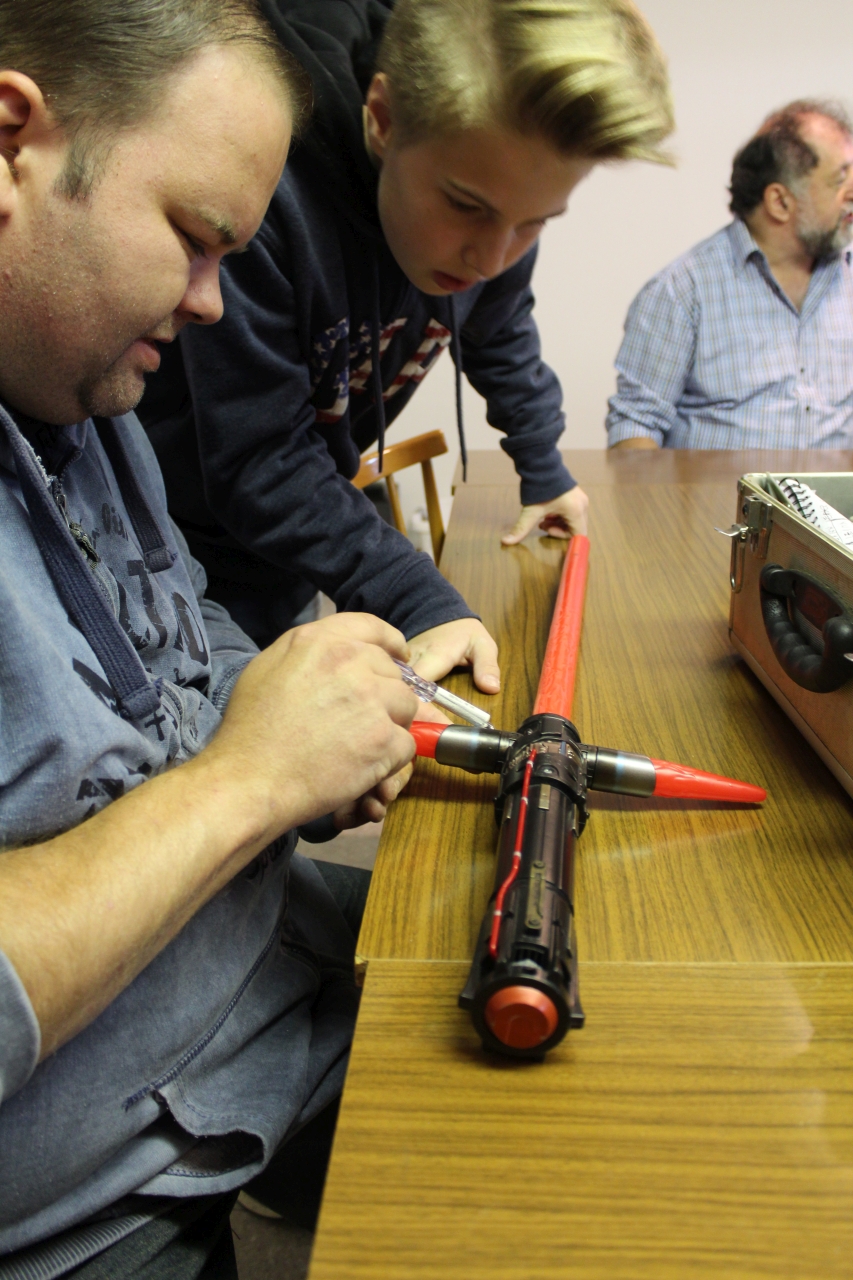 Das man auf Augenhöhe mit der heutigen und zukünftigen Technik sein muss, beweist der Umstand das auch Lichtschwerter zur Reparatur zu uns gebracht werden. Sogar dafür hatten wir einen Experten Vor-Ort und das Lichtschwert ist wieder fit für den nächsten Kampf gegen die Dunkle Seite der Macht. Der Termin für das nächste Repair-Café steht zwar noch nicht fest, aber es wird in jedem Fall eins geben. Am besten per E-Mail erinnern lassen. Wer also noch einen defekten Flux-Kompensator hat: Wir sind bereit, Doc!