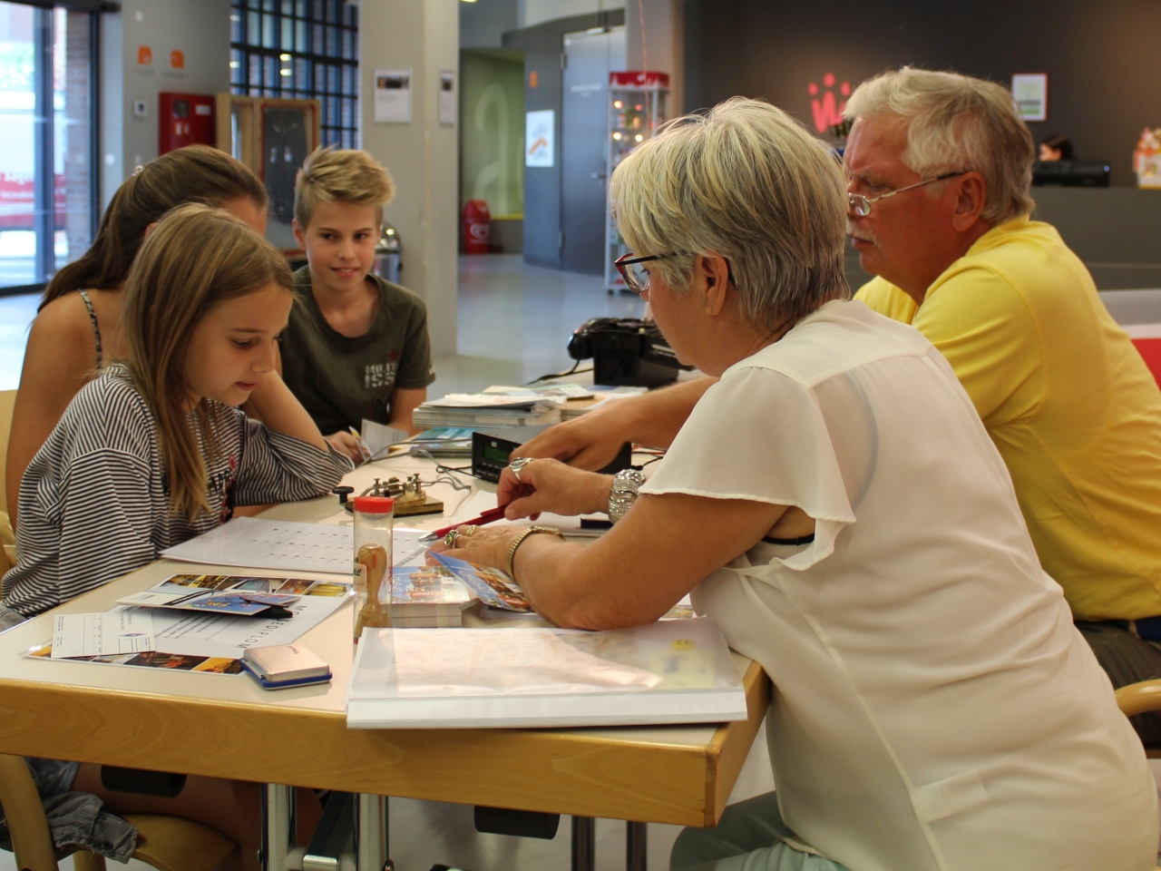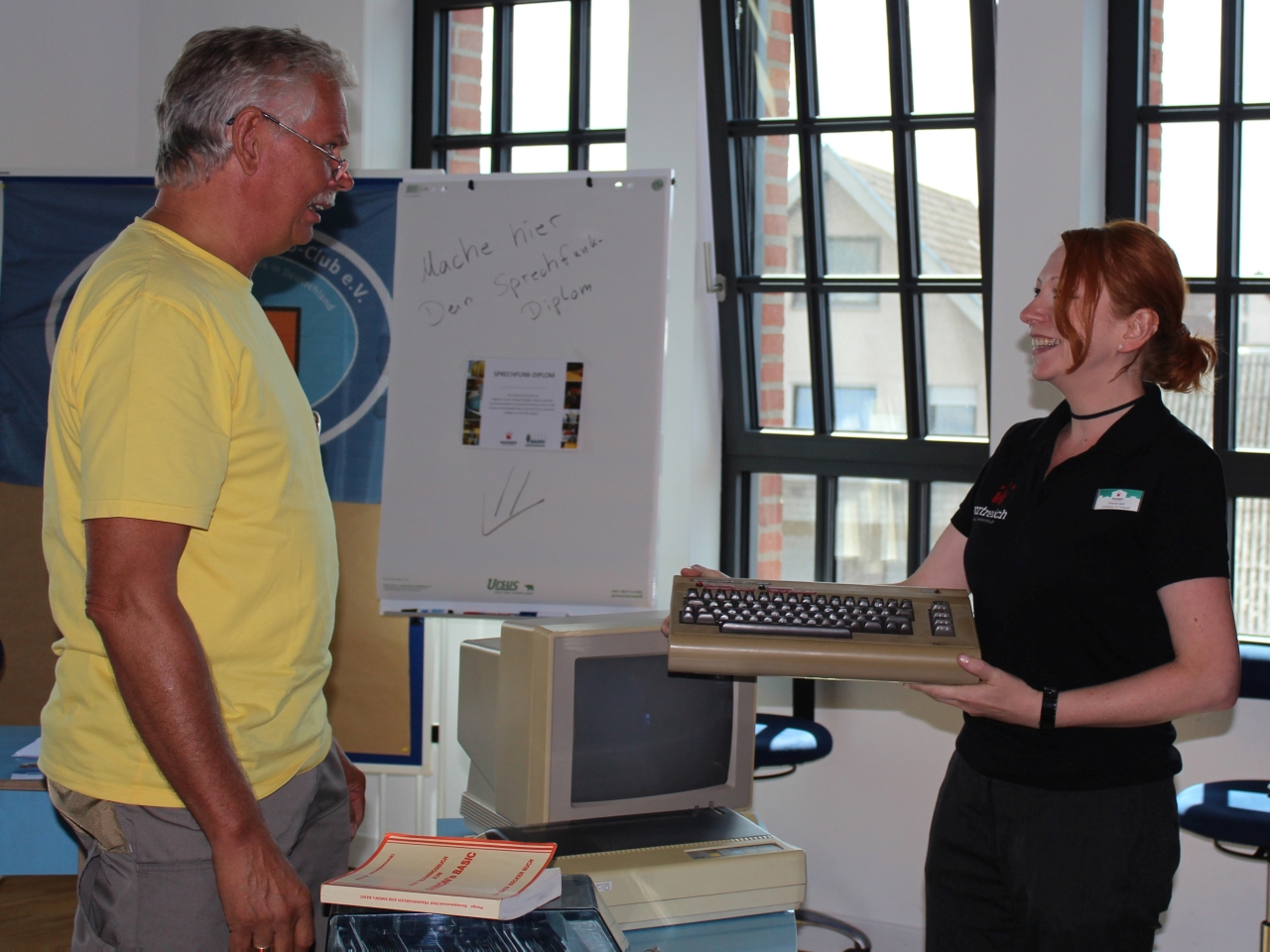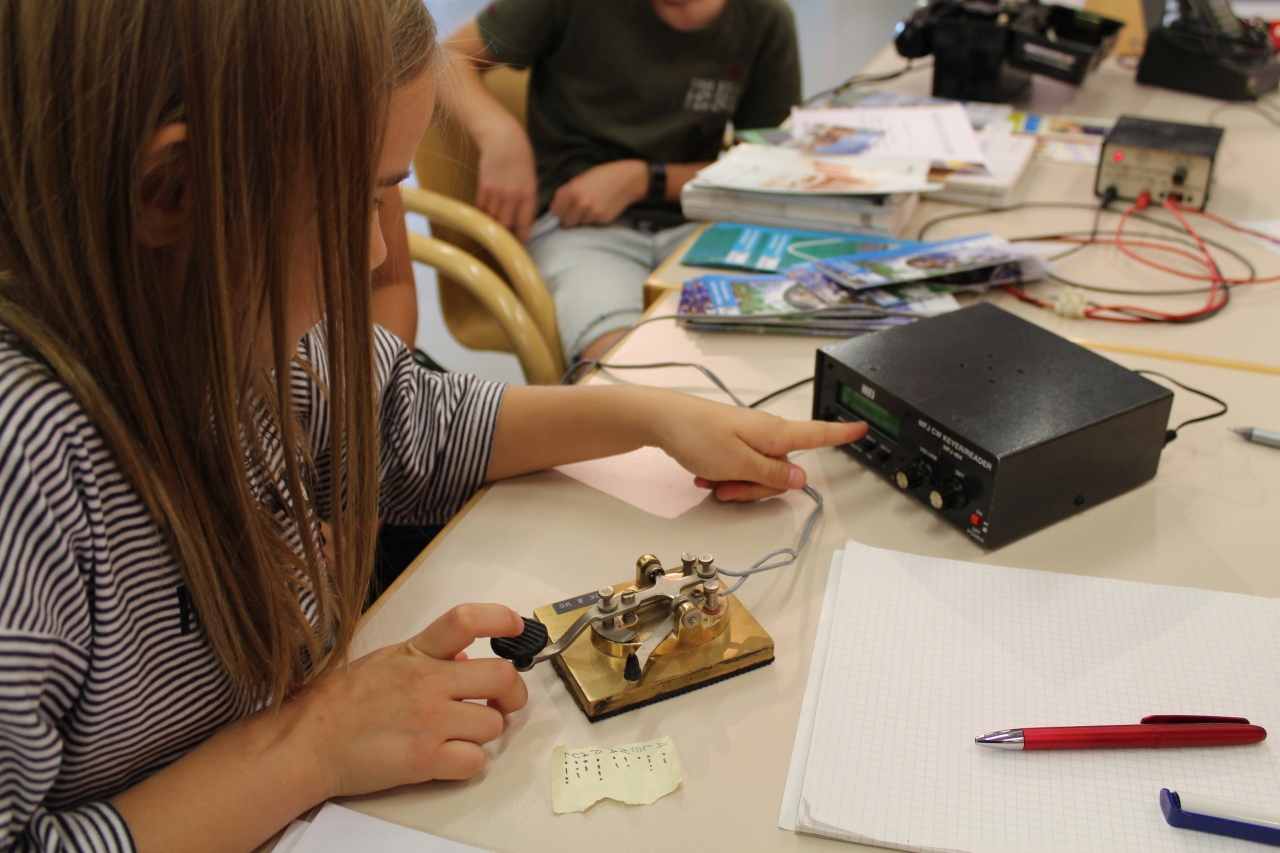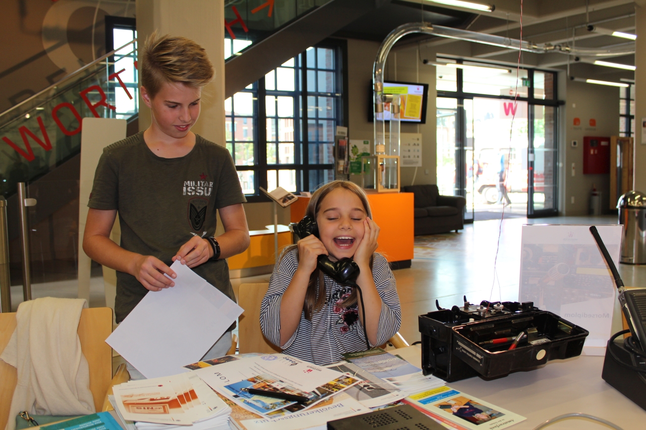 Im großzügigen Foyer des Wortreich werden die Besucher bereits von den sanften Tönen der Morsestation empfangen. Claus DK8WG und Tatjana nehmen von den großen und kleinen Gästen die Prüfung zum Morsediplom ab. Jeder muss seinen Namen einmal fehlerfrei an der Morsetaste geben, dann bekommt er das Morsediplom und eine QSL-Karte als Erinnerung. Damit den wartenden, zukünftigen Inhabern der Diploms nicht langweilig wird, steht neben der Morsestation noch ein Feldfernsprecher, in Fachkreisen auch „Acker-Schnacker“ genannt, der selbstverständlich ausgiebig getestet wurde.